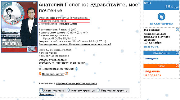 Впрочем, надо отдать им должное, один действительно прекрасный диск на Blu-ray они все-таки выпустили. Вот тут - просто нет никаких претензий. Все поклонники этого прекрасного певца приобретут данный диск не задумываясь. Тем более, что и цена на удивление невысокая. Правда, это упрощенный Blu-ray - DVD называется. Но ведь написано-то Blu-ray...