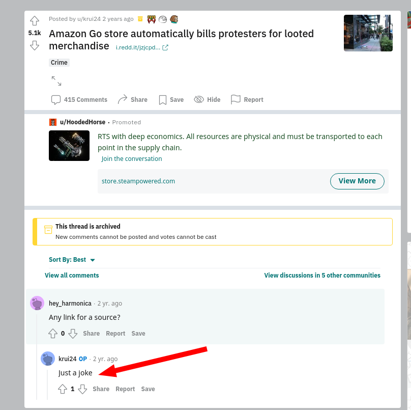 Reddit-пользователь u/krui24 сообщает, что такая ситуация возникла вокруг как минимум одного магазина Amazon Go в Сиэтле. Эта торговая точка подверглась нападению со стороны демонстрантов, участвовавших в протестах «Black Lives Matter» из-за убийства полицией Джорджа Флойда. В сообщении Reddit утверждается, что протестующие подвергли магазин Amazon Go разграблению и забрали из него несколько предметов. Но оказалось, что установленная в магазине система автоматического сканирования оказалась умней, чем предполагали грабители.