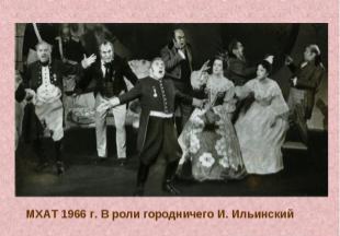 Городничий посередине в виде столба, с распростертыми руками и закинутою назад головою. По правую сторону его жена и дочь с устремившимся к нему движеньем всего тела; за ними почтмейстер, превратившийся в вопросительный знак, обращенный к зрителям; за ним Лука Лукич, потерявшийся самым невинным образом; за ним, у самого края сцены, три дамы, гостьи, прислонившиеся одна к другой с самым сатирическим выраженьем лица, относящимся прямо к семейству городничего. По левую сторону городничего: Земляника, наклонивший голову несколько набок, как будто к чему-то прислушивающийся; за ним судья с растопыренными руками, присевший почти до земли и сделавший движенъе губами, как бы хотел посвистать или произнесть: «Вот тебе, бабушка, и Юрьев день!» За ним Коробкин, обратившийся к зрителям с прищуренным глазом и едким намеком на городничего; за ним, у самого края сцены, Бобчинский и Добчинский с устремившимися движеньями рук друг к другу, разинутыми ртами и выпученными друг на друга глазами. Прочие гости остаются просто столбами. Почти полторы минуты окаменевшая группа сохраняет такое положение. Занавес опускается