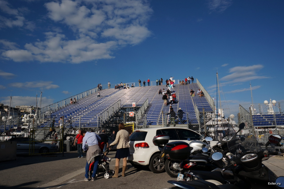 День гонки, мы снова на яхте. Идут разогревочные заезды. Заметьте, что на трибунах места полно. Но к самой гонке трибуны еще заполнятся.