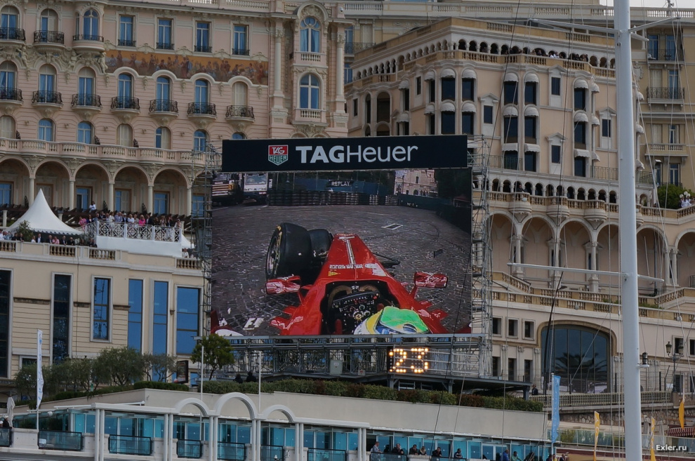 За гонкой удобнее всего следить на огромном табло, висящем недалеко от казино. Здесь как раз показывают драматичный момент, как Масса разбивает свой болид - хорошо что сам не пострадал. На экране было видно, как у машины вдруг заблокировались передние колеса и болид стал неуправляемым. Масса потом говорил, что он во время торможения задел кочку и колеса почему-то заблокировались - в результате последовало два удара об отбойники. Кстати, во время этих свободных заездов было еще две аварии - к счастью, без жертв.