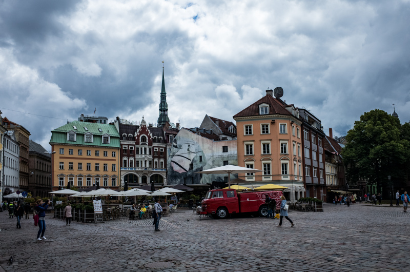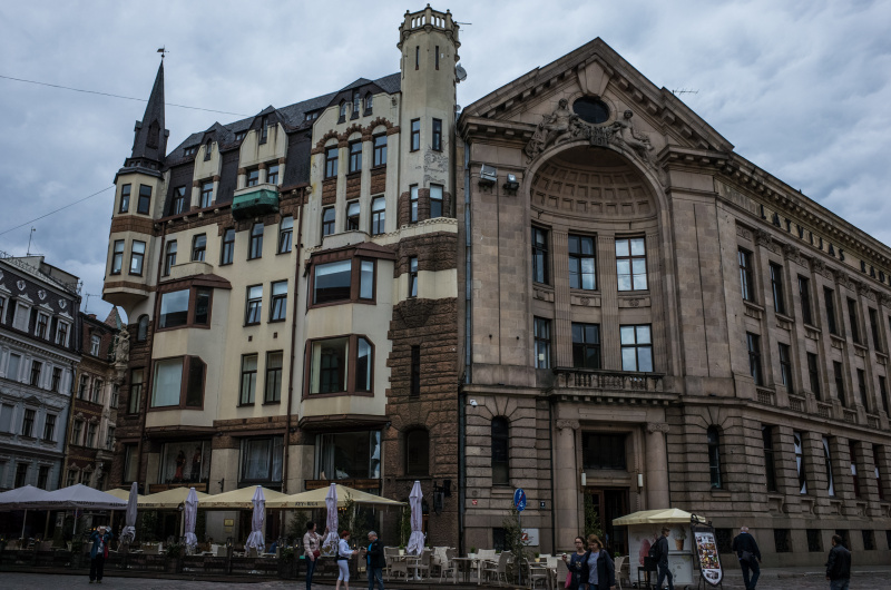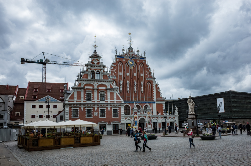Вид на знаменитый Дом Черноголовых изрядно портит кран, стоящий сзади. Там снесли какое-то старое здание и строят новую современную гостиницу. Кстати, здесь же, рядом с Ратушной площадью, открылся новый аттракцион: "Полет над Ригой 5D" от "Турецких авиалиний". Садишься в самолетное кресло, пристегиваешься, после чего на большом экране смотришь фильм с полетами над Ригой и по Риге, включая пролеты внутри президентского дворца и музеев. Кресло отклоняется туда-сюда, создавая эффект присутствия, тебя периодически слегка обливают водой, кресло потрясывает,также есть и другие спецэффекты. Но экран плоский и эффект погружения не такой, как, например, на аналогичном аттракционе в Юниверсал Студио в Лос-Анджелесе или в Феррари-Парк в Порт Авентуре. Но фильм сделан очень добротно и интересно, так что рекомендую приобщиться, если будете в Риге.