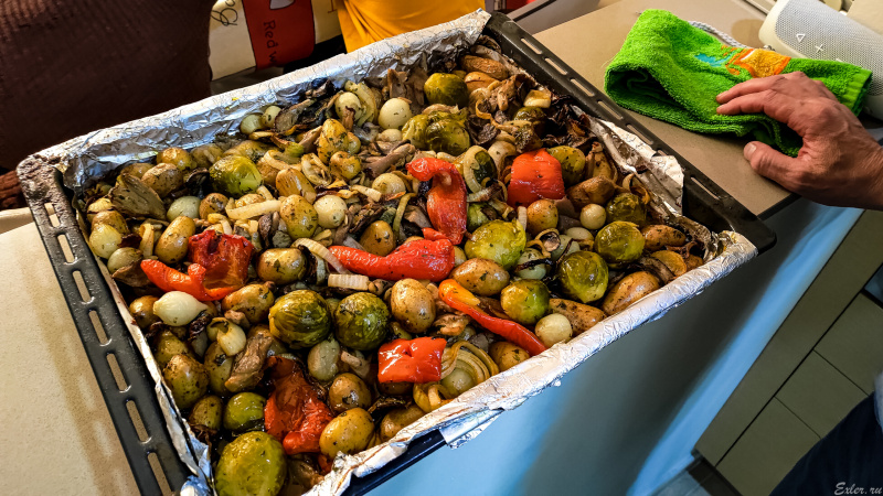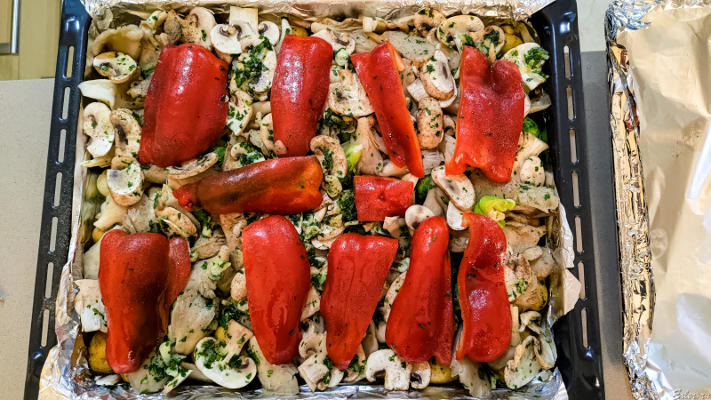 Подготовили овощи для духовки: молоденькая картошка, шампиньоны, лук, брюссельская капуста, перцы.