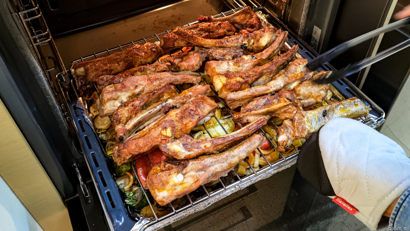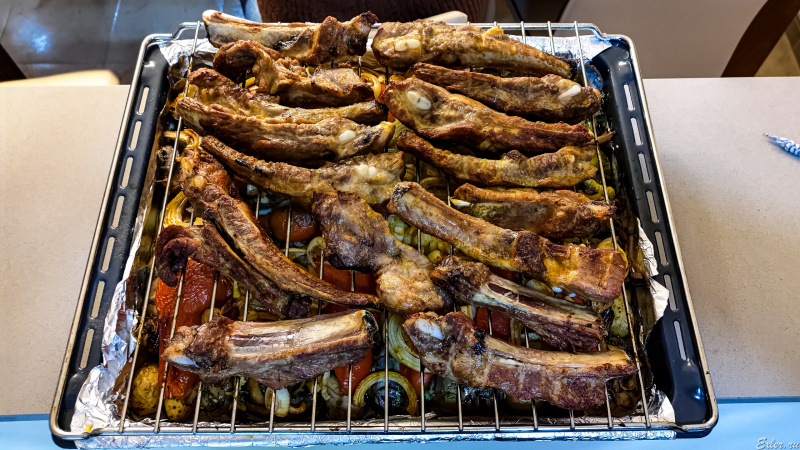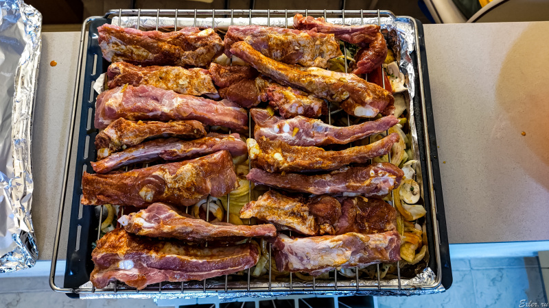 Сверху на овощи поставили решетку с крупными свиными ребрышками, которые сутки мариновались в репчатом луке, специях и оливковом масле.