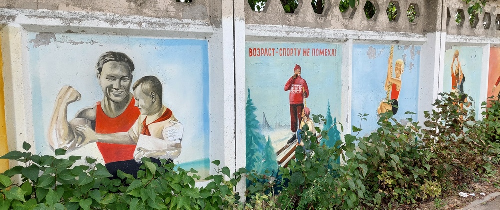 В Дубне забор стадиона разукрасили мишкой в разных видах спорта. Да и не только. Стилизованные под разные времена открытки тоже есть.