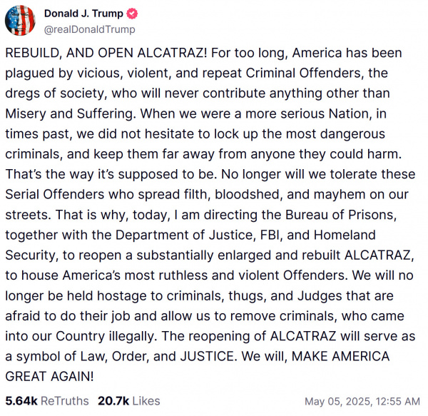 ВОССТАНОВИТЕ И ОТКРОЙТЕ АЛКАТРАЗ! Слишком долго Америка страдает от жестоких, насильственных и рецидивирующих преступников, отбросов общества, которые никогда не принесут ничего, кроме страданий и боли. Когда мы были более серьезной нацией, в прошлом мы не колебались, заключая в тюрьму самых опасных преступников и держа их подальше от тех, кому они могли навредить. Так и должно быть. Мы больше не будем терпеть этих серийных преступников, которые сеют грязь, кровопролитие и хаос на наших улицах. Поэтому сегодня я поручаю Бюро тюрем, Министерству юстиции, ФБР и Министерству внутренней безопасности вновь открыть значительно расширенную и перестроенную тюрьму АЛКАТРАЗ для содержания самых жестоких и опасных преступников Америки.