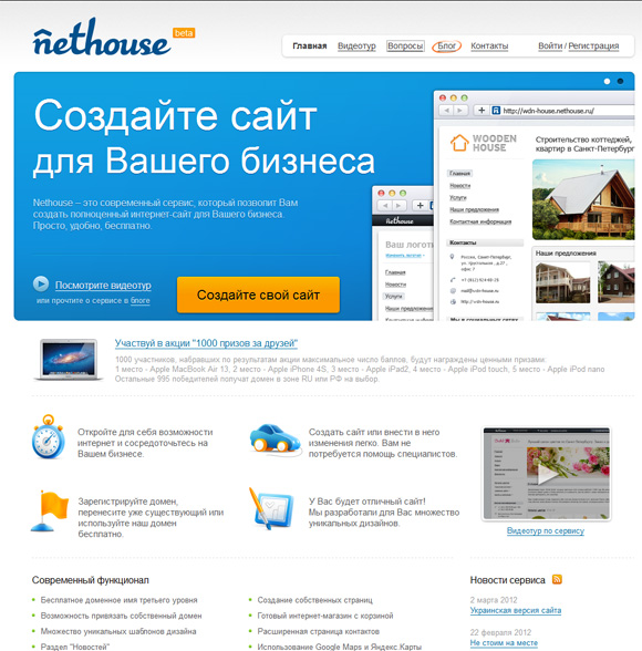До 2 мая на сайте действует специальная акция - "1000 друзей". Вы привлекаете новых активных пользователей - они создают с помощью Nethouse сайты для своего бизнеса и также рекомендуют сервис своим друзьям и знакомым. Акция завершится 2 мая 2012 года. Для участников, которые наберут максимальное число баллов, подготовлены ценные призы: Apple MacBook Air, iPhone 4S, iPad2, iPod touch, iPod nano и 995 доменов RU/РФ.