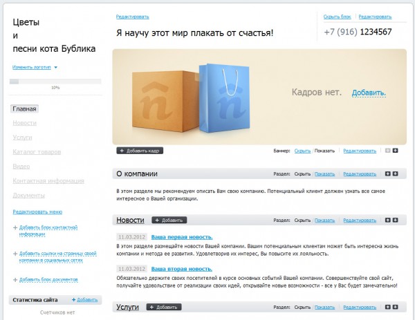 В редакторе сделано все, чтобы максимально облегчить вам процесс создания сайта. Вы можете добавлять и редактировать данные о фирме, контактную информацию, создавать каталог видов услуг, которые сразу можно будет заказать на сайте, а также создавать каталог ваших товаров с ценами, и эти товары посетители сайта смогут класть в корзину и заказывать.