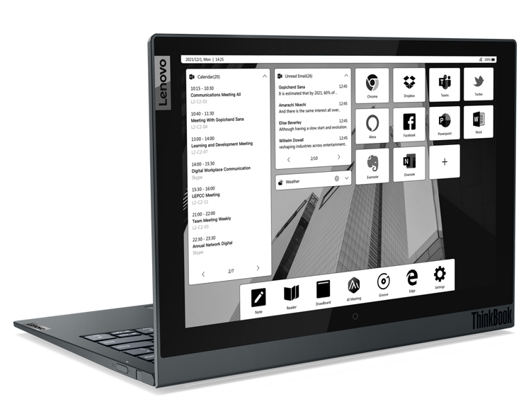 На внешней стороне крышки расположен дисплей на электронной бумаге E Ink. Эта 12-дюймовая панель также имеет разрешение 2560 × 1600 пикселей и поддерживает сенсорный ввод. Таким образом, использовать компьютер можно в качестве ридера.