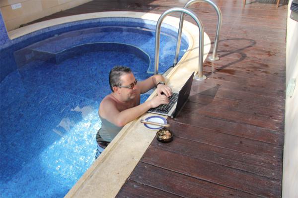 Да уж -- нелегко! Всё время надо следить, чтобы мокрыми руками не залить клавиатуру. Это не то, что в тепличных условиях московского офиса!