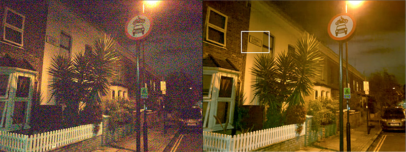 На представленных примерах видно, что RawNeRF не только убирает шумы, но также восстанавливает цвета и повышает резкость. Доходит до того, что полностью нечитаемый текст на оригинальном изображении становится вполне различимым.