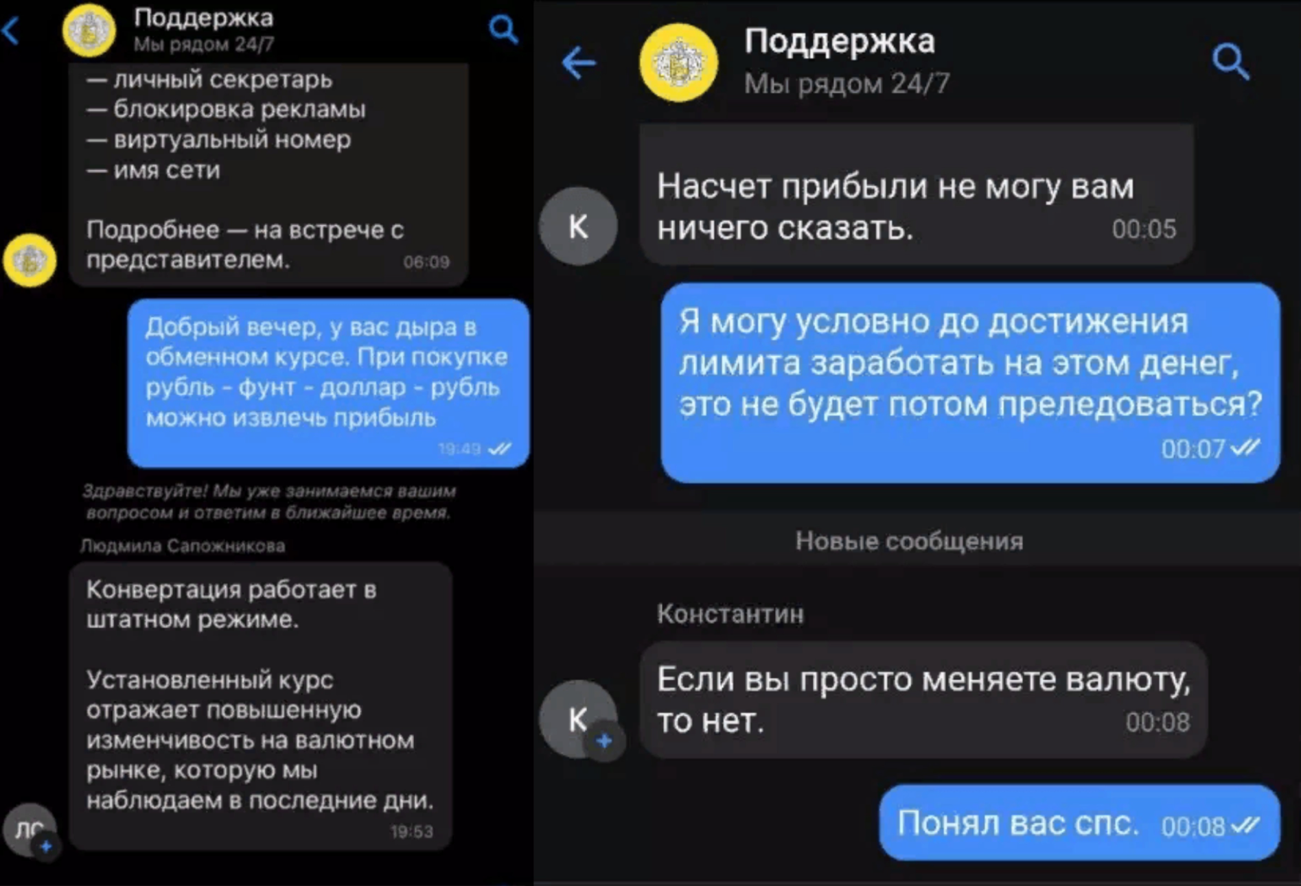 При этом во время общения с менеджерами Симонов повторно уточнял, связана ли блокировка с операциям по конвертации. «Менеджер отвечал, что все услуги, которые банк предлагает в приложении, обоснованы и можете смело ими пользоваться хоть до посинения, никаких злоупотреблений тут нет», — вспоминает трейдер.