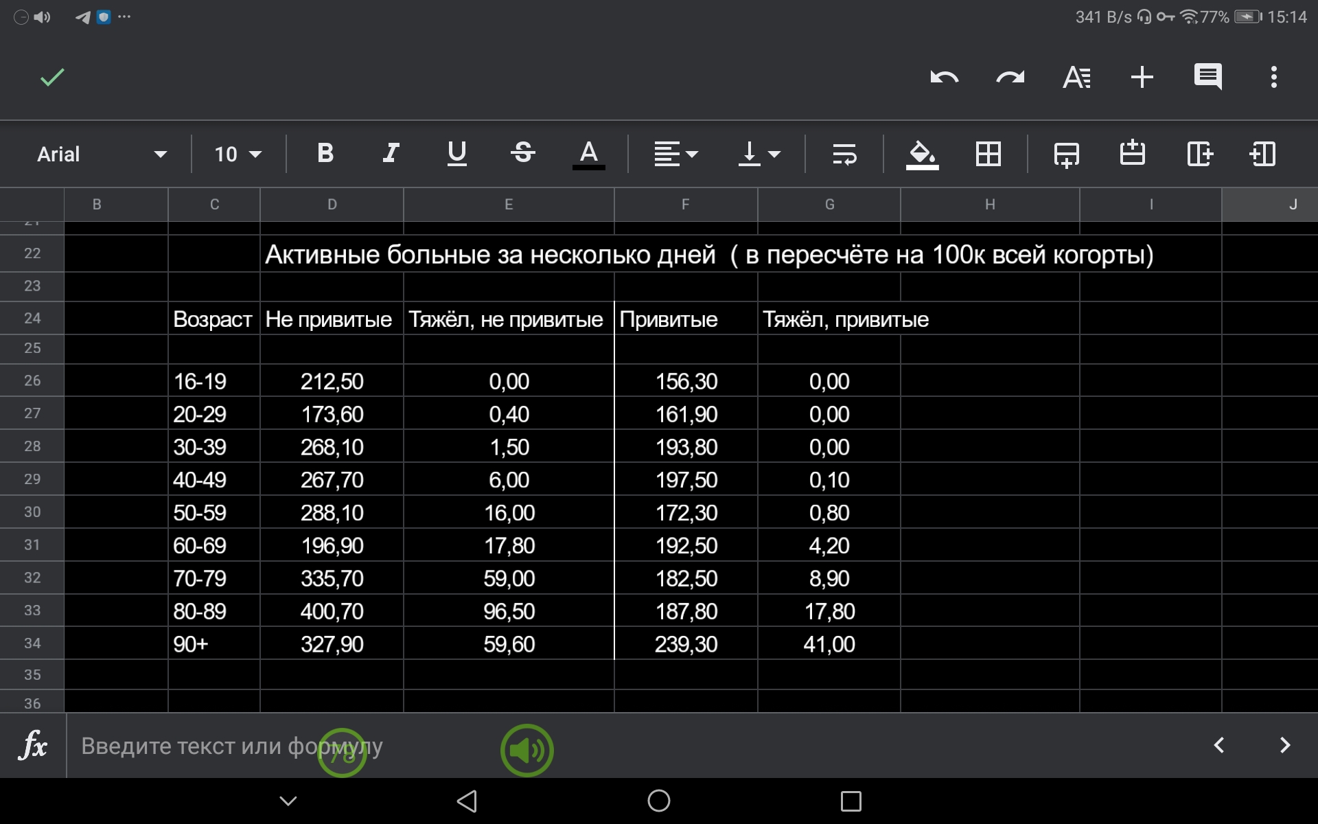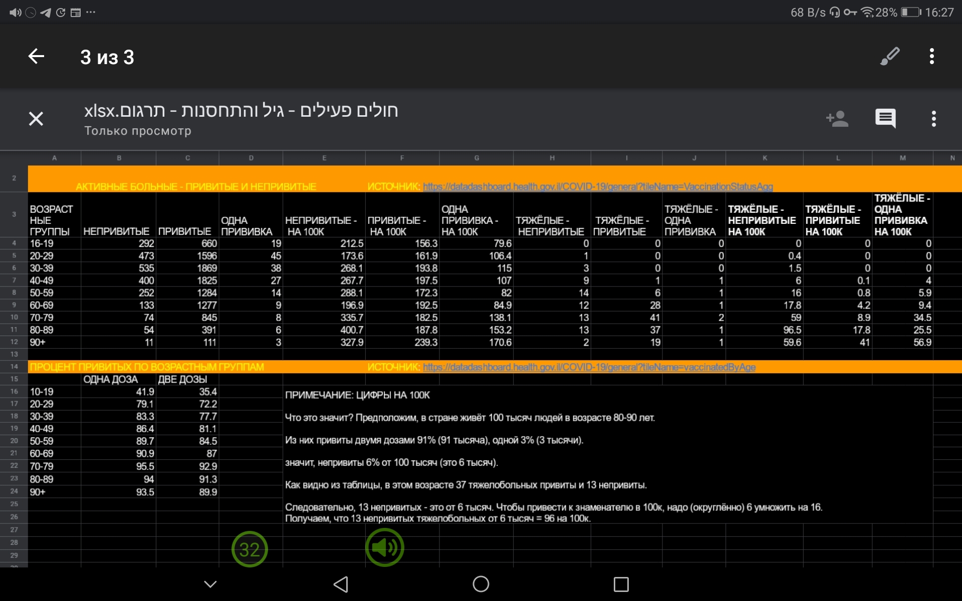 Информация интересна тем, что она распределена по возрастам. Итак взяты все активные больные за несколько дней в августе и сравниваются числа привитых двумя дозами тяжёлых больных с непривитыми.