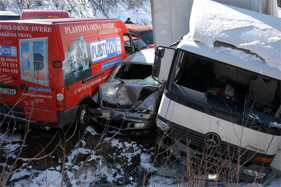 Под Прагой вчера была сильная метель. Причем налетела она внезапно - посреди ясного солнечного неба. Дорога тут же покрылась гололедом и снегом, фуры начало заносить, машины стали сваливаться в кювет - в общем, пострадало более сотни машин, пробка растянулась на 30 километров. Вот фотографии очевидца Pasha Vovk. И вот пара фоток оттуда: