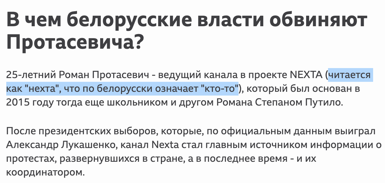 В самом начале, когда Экслер начало активно цитировать Нехту, пошел посмотреть их старые ролики на ютюбе. Два предложенных (может самых рейтинговых) были полным стыдом: в одном показывали нарезку криминальной хроники, как сельский милиционер избил любовника жены, с утверждением, что раз верные опричники такие, значит такой и режим диктатора. Авторов не смутило даже то, что это была нарезка именно милицейской съёмки - жестокий режим завел дело на своего прислужника. В другом издевались над тем, как Лукашенко сажает арбузы в каком-то колхозе. Ну, там вообще смысла особого не было. Всё это сопровождалось буффонадными сценками в исполнении самой Нехты. Мне как украинцу могло только одно прийти в голову: неужто в Белоруссии нет серьезных проблем, чтоб типа как оппозиция могла снимать нормальные сюжеты?! Или в Нехте совсем дебилы?!