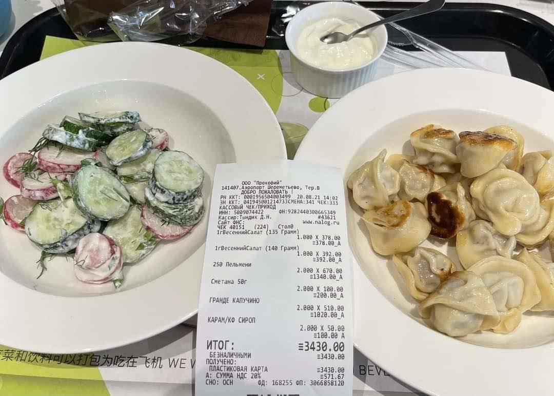 По сети гуляет: человек пообедал в кафешке в "Шереметьево". Копеечный салат, слегка подгоревшие пельмени, сметана, капучино и карамельный сироп - 3430 рублей. Это €40. За 40 евро в Испании в ресторане можно получить четыре бизнес-ланча: закуска, основное блюдо, десерт, напиток (вино, пиво, прохладительный напиток). Вот за кофе придется доплатить отдельно, да, это еще где-то чуть больше евро.
