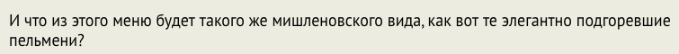И что из этого меню будет такого же мишленовского вида, как вот те элегантно подгоревшие пельмени?