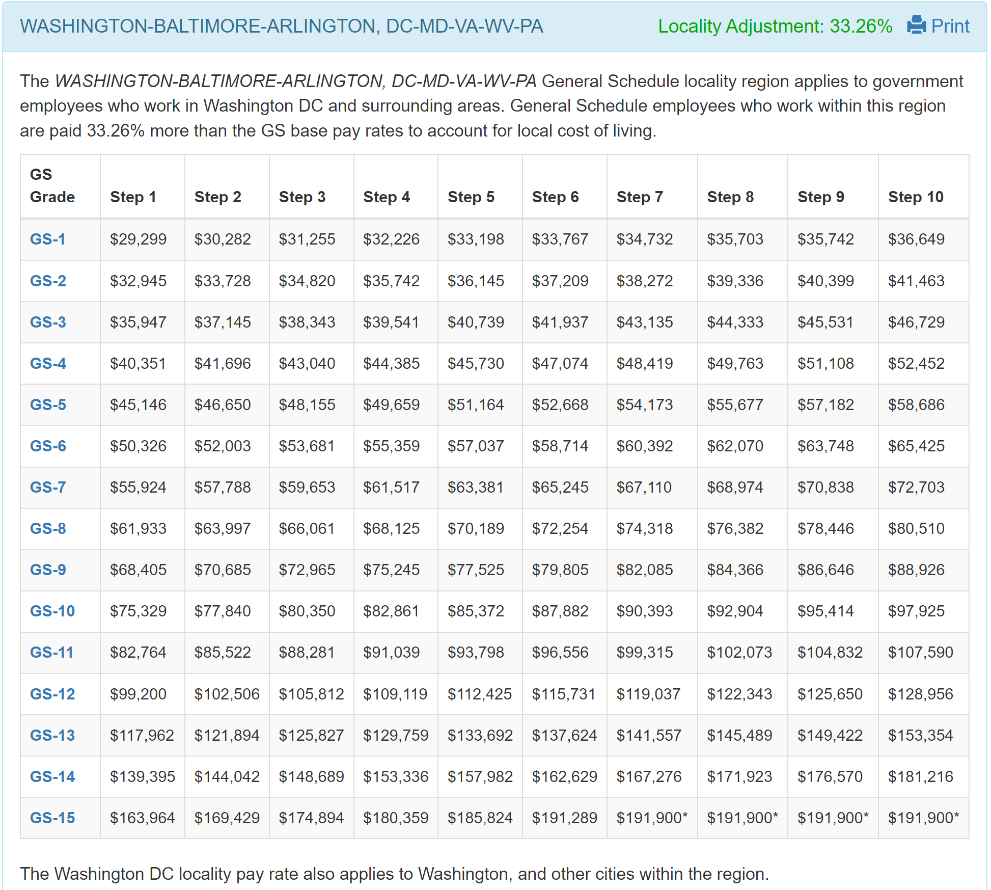 Таблица для Вашингтона. Для справки: GS-12 - высшая ступень, не предполагающая найма по итогам соревнования на федеральном уровне (Non-competitive, не знаю как это сказать по русски).