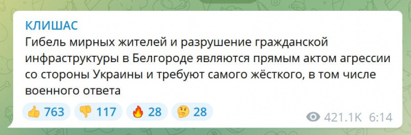 Клишас разоряется в своем телеграм-канале. Интересно, ему кто-нибудь намекнет о том, что Россия воюет в Украине уже 130-й день? А то он, может, не в курсе.