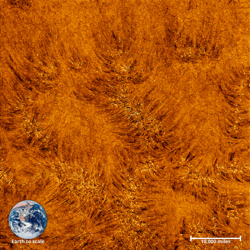 На следующем изображении показан регион диаметром 82 500 километров с разрешением 18 км, на который для масштаба наложена Земля. Изображение получено в «G-диапазоне» Фраунгофера на длине волны 430 нанометров. Осознайте масштаб, что называется!