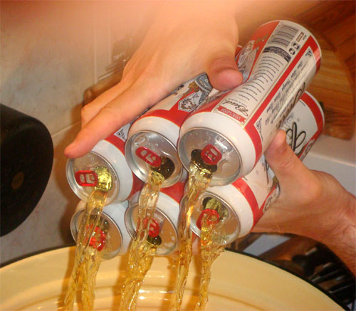 Варят раков, разумеется, на пиве. Для первой варки обычно покупается что-нибудь прилично-баночное - как правило, в больших бочонках, - но в этот раз взяли обычные поллитровые банки со светлым "Бадвайзером", поэтому упражнялись в том, сколько банок за раз можно удержать в руках. У V. был рекорд, по-моему, семь банок (заснять не сумели, поэтому на снимке только шесть).