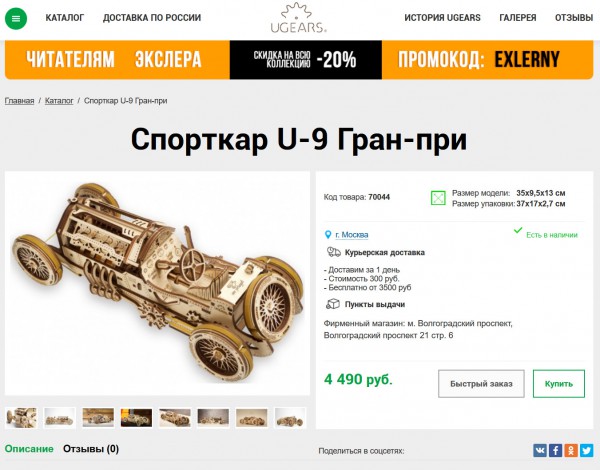 Собственно, почему я об этом написал заранее, а не сделал обзор, как обычно? Просто компания UGEARS любезно предложила к Новому году скидку для моих читателей в 20% на все модели (это уже существенно, не 5%), причем скидка будет работать не только на розничные заказы, но и на оптовые. Промокод - exlerNY.