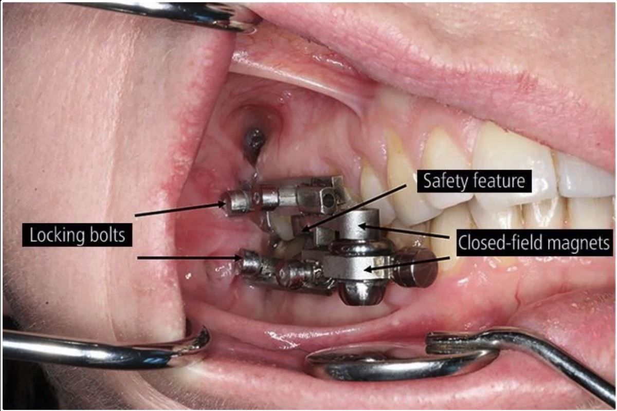 Прибор удерживается за счёт ортодонтического цемента. Указывается, что он не ограничивает дыхание или речь, но помогает держать строгую диету. Магнитные запоры и болты изготавливаются на заказ, а носитель получает специальный ключ, с помощью которого можно в любой момент освободиться. В ходе эксперимента семь человек носили подобное приспособление в течение 14 дней. Они получали жидкую еду из магазина на 1200 калорий в сутки. В результате средняя потеря веса составила 6,36 кг.