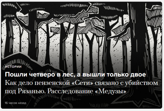 И вот сегодня я открываю "Медузу" и читаю их новое "расследование", которое стоит на главной странице и предподнесено как статья дня - "Пошли четверо в лес, а вышли только двое Как дело пензенской «Сети» связано с убийством под Рязанью. Расследование «Медузы»". Ссылку дал, да. С одной стороны, как бы нехорошо рекламировать подобные вещи, но оно заслуживает изучения для понимания того, куда вообще скатилось данное издание.