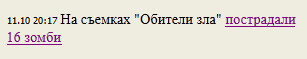 Да, вчера читал местные новости - было смешно (правда, один таки в тяжёлом состоянии в больнице, но ирония всёравно есть). Там ещё писали отзывы группы скорой помощи, которая приехала и удивилась внешнему виду пострадавших: "Они все выглядели очень, очень больными, на них были множественные царапины, синяки и кровоподтёки. И лишь потом мне дошло, что это костюмы и макияж...". Недалеко снимают, кстати, надо будет проехаться туда - всётаки Resident Evil - моя вечная любовь 😄