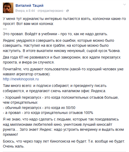 Да, один из создателей "Кинопоиска" Виталий Таций написал вот это.