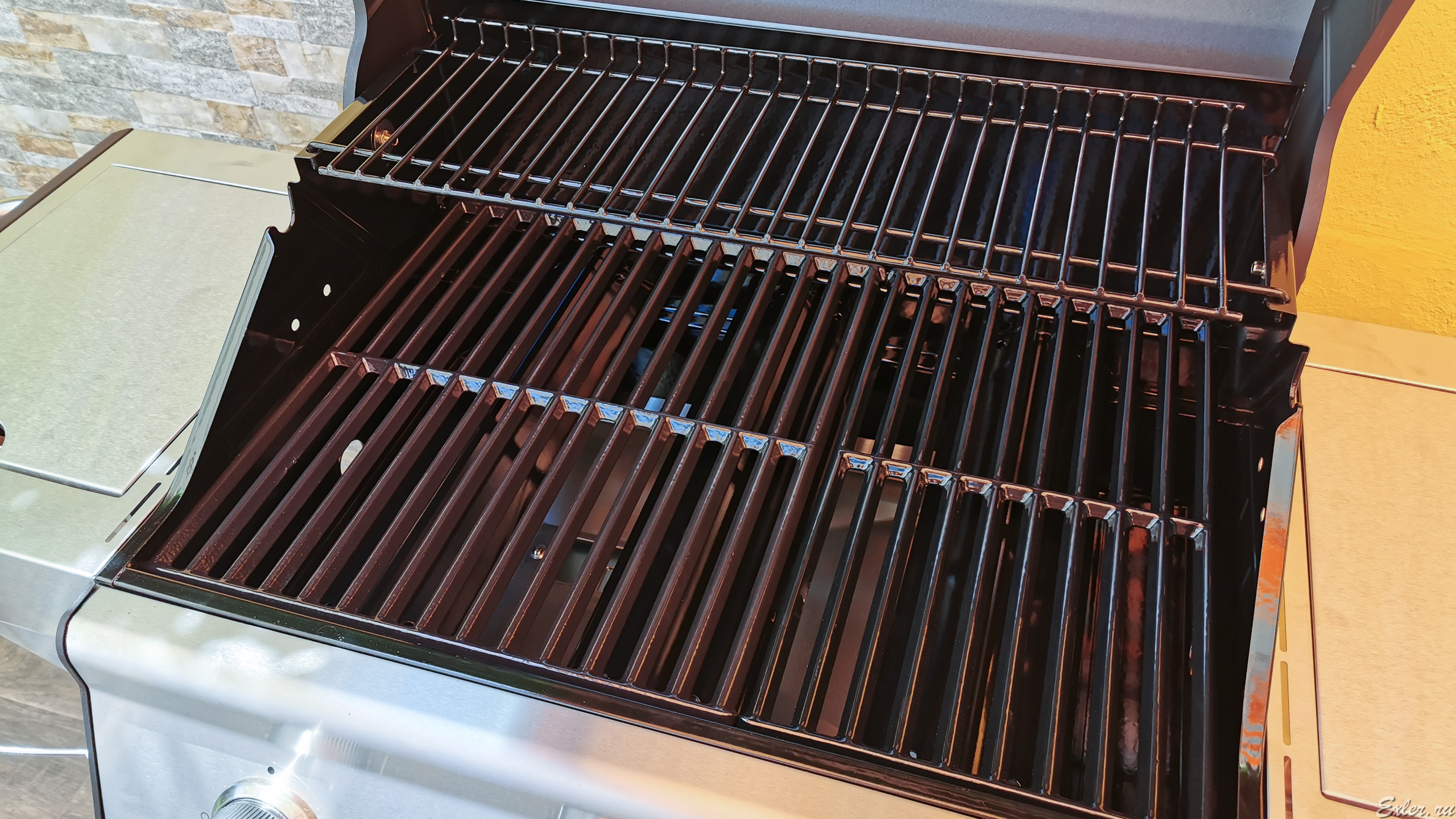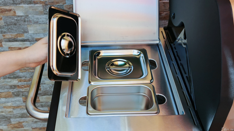 Решетка состоит из двух секций: одна большая, вторая заметно меньше. Вторую секцию можно заменить на планчу - сплошную жарочную поверхность. Есть третья решетка сверху: откидывать на нее готовое мясо, чтобы не пережарилось и не остыло.
