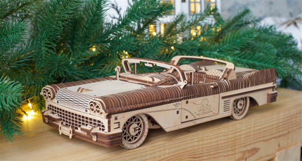 Это классные конструкторы из натурального дерева. Их вырезают на высокоточном лазерном станке, поэтому все детали идеально подходят друг к другу – собираются без всякого клея, инструментов и прочего крепежа. А самое крутое: модель получается двигающаяся! Если это машина, она поедет. Если сейф, он будет закрываться-открываться. И так далее. Отличный подарок детям до 70 и старше.
