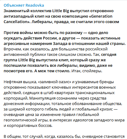 И как уже ниже правильно заметили - антураж почему-то скорее про американцев, а не про Кремль. Да и поют про "generation cancellatiom". Как по мне, так всё понятненко - чей именно это "антивоенный клип" и против кого. А учитывая татуировки на кириллице...