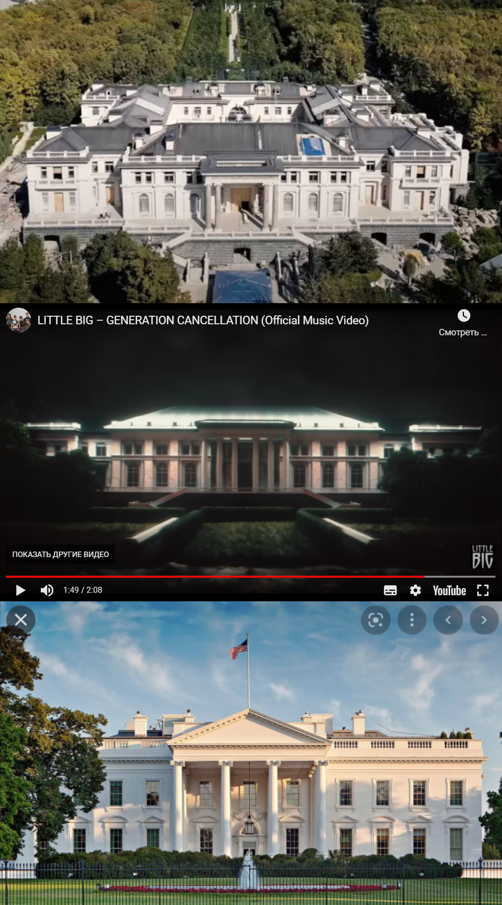 Где вы там "Белый дом" увидели? Дом в клипе - копия и прямая отсылка на дворец Путина в Гялинджике. Опять же уничтоженные российские танки перед домом. Намёк на пушечное мясо.