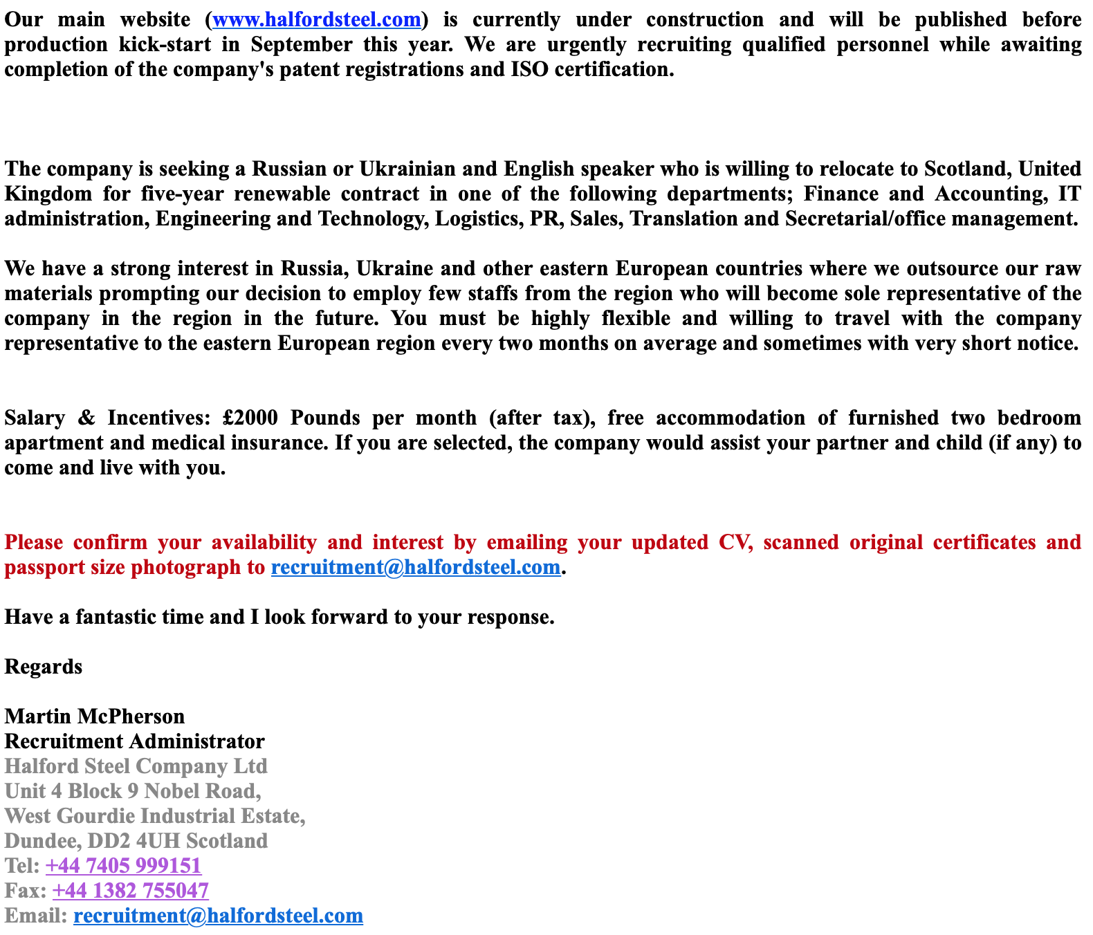 В один прекрасный день я получила письмо, в котором сообщалось, что компания Halford steel company, которая была основана в (и вот первая ласточка несоответствия) июне этого года и поэтому ее сайт находится сейчас в разработке (вторая ласточка) ищет сотрудников со знанием русского и украинского языков. Если меня интересует подобное предложение, то меня просят подтвердить свое согласие участвовать в последующем отборе персонала. Знаете, как-то все подозрительно звучало, но на сайте о поиске работы, на который они ссылались в письме, действительно завалялось мое резюме столетней давности. Я решила, что согласие я могу дать и ничего мне за это не будет (я же девушка – сегодня согласна, а завтра нет). Вместе с согласием просили прислать резюме с фото (третья ласточка, а может и просто не ласточка вовсе). Попыталась нарыть что-то в интернете, но ничего не нашла. Ладно. Посмотрим, что будет дальше.