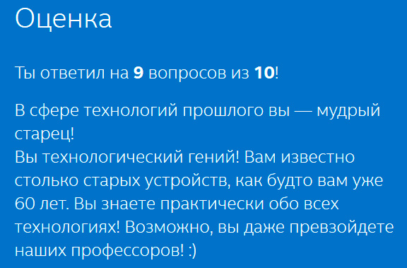 Вы технологический гений! Вам известно столько старых устройств, как будто вам уже 60 лет. Вы знаете практически обо всех технологиях! Возможно, вы даже превзойдете наших профессоров! 😄 Начать сначала »