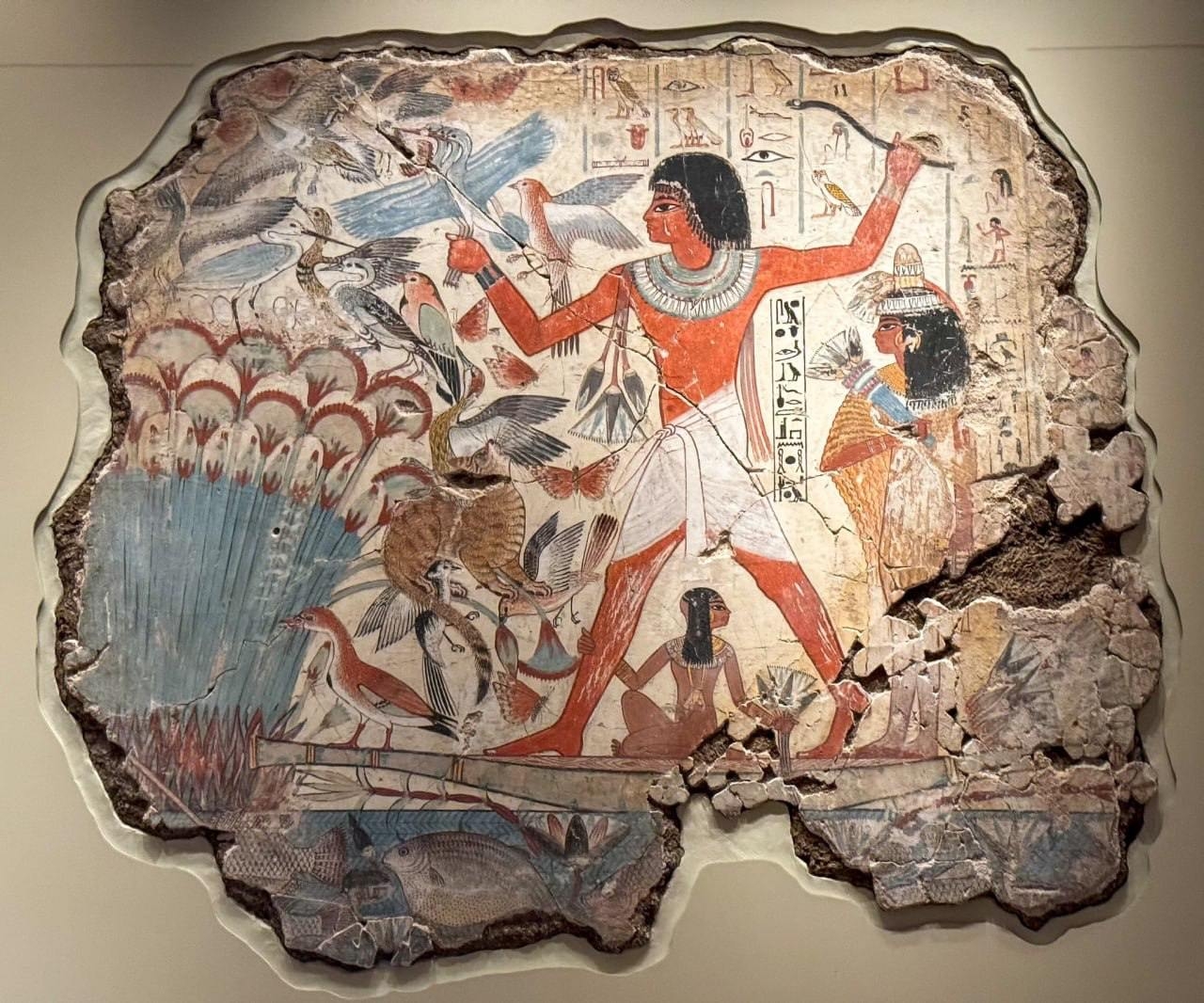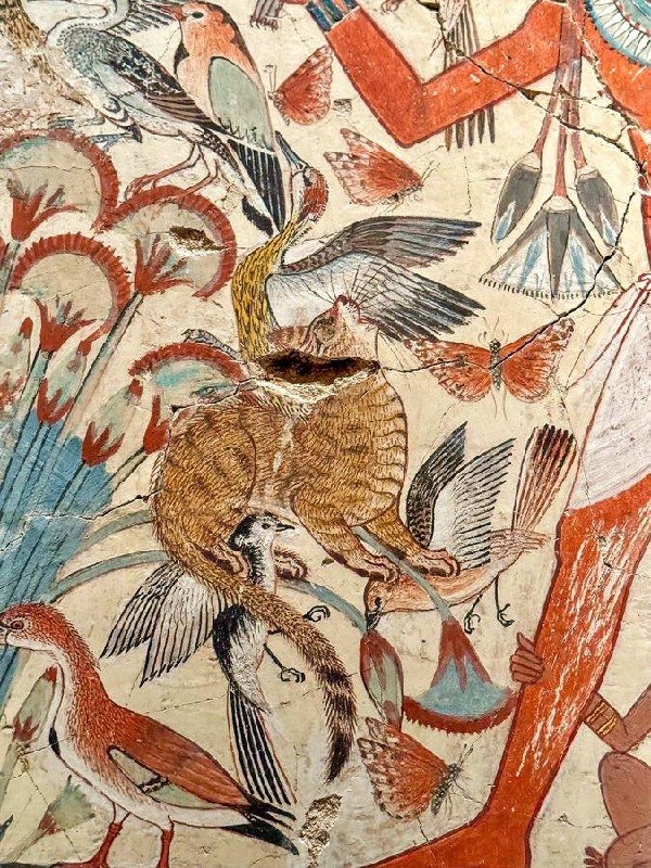 Фреска изображает Небамуна со своим любимым котом на охоте в зарослях папируса в царстве мёртвых. Вероятно, к этому времени кот уже умер, опередив своего хозяина, но тут он непревзойденный охотник, поймавший трех птиц. Обратите внимание, глаз кота на фреске был инкрустирован.