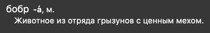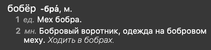 "Согласно Орфографическому словарю 2004 года, оба варианта произношения являются нормативными: бобёр — бобра́ (животное; мех); бобр — бобра (животное)"