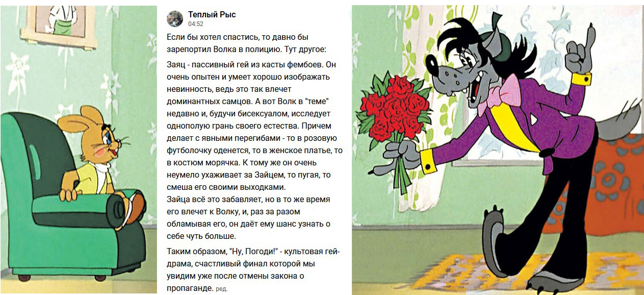 Я правильно понимаю - что Волк - - черный (негр), плохой, а Заяц - белый,хороший 😄 Да еще на ютубе, как еще за забанили ...
