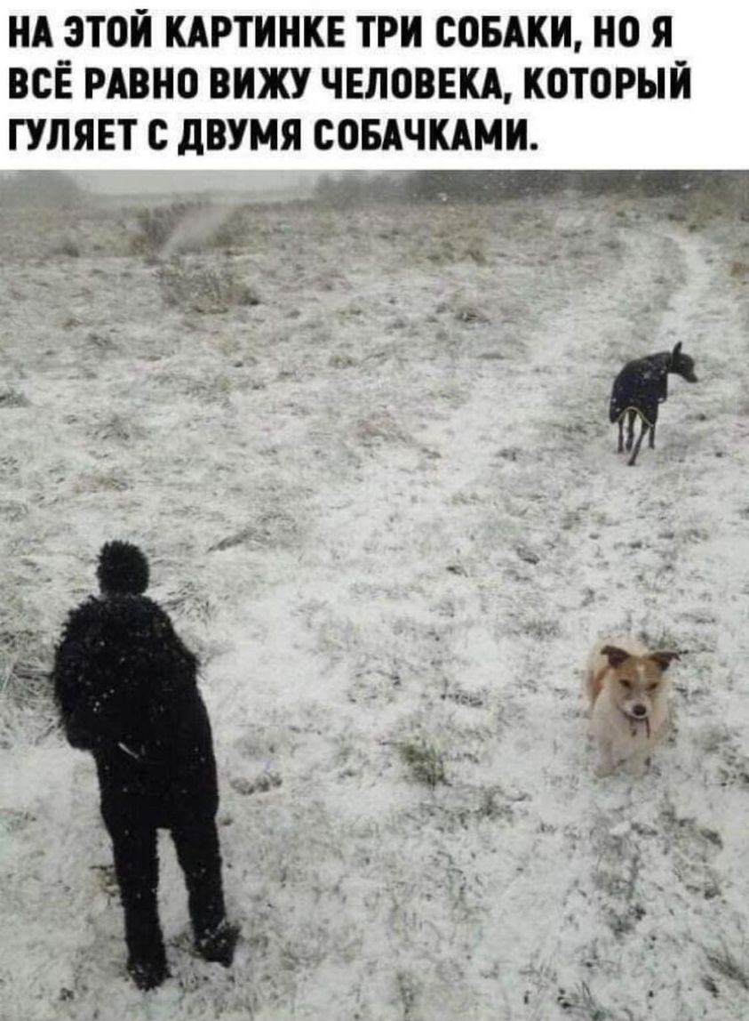Там вместо человека - чёрный заснеженный пудель, а человеческая якобы "голова" - это хвост. ))