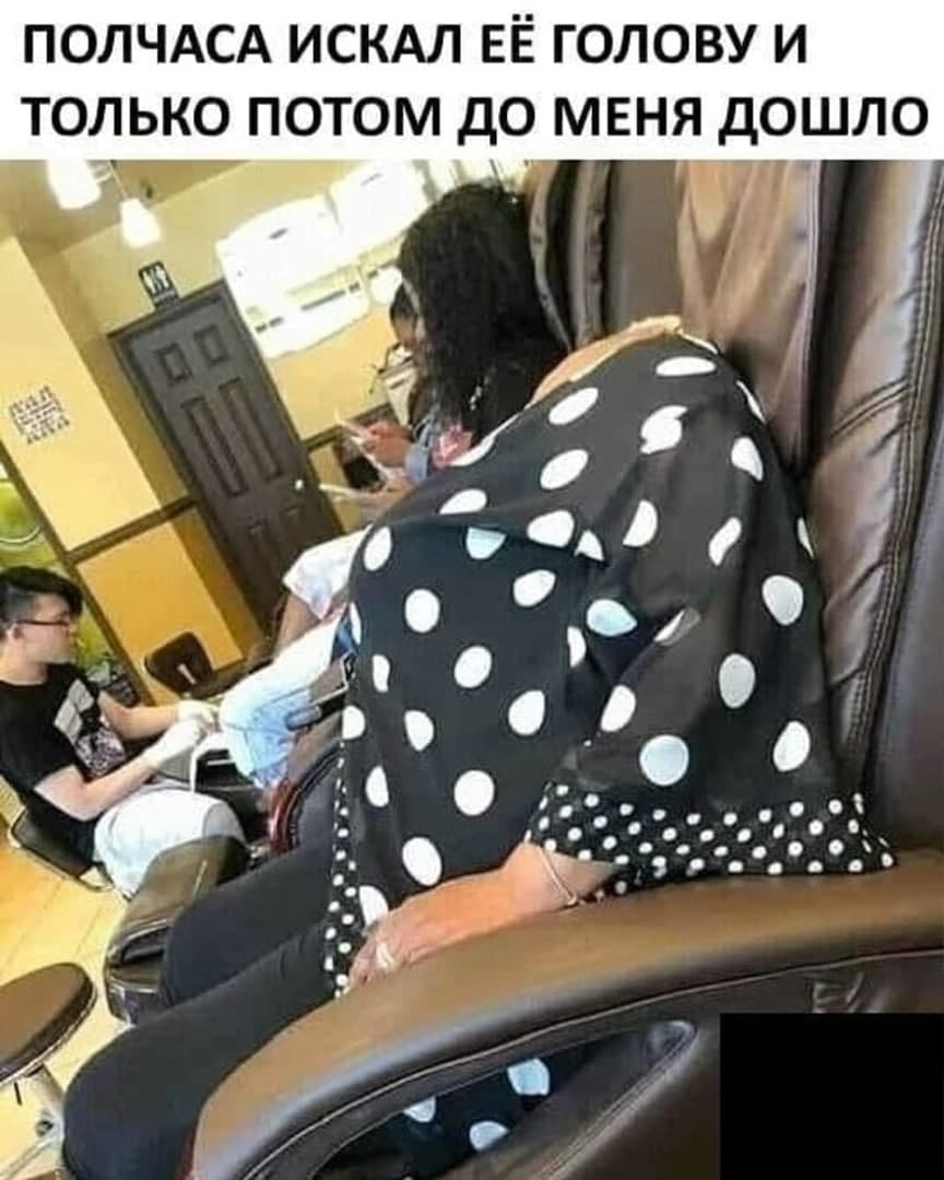 Мне кажется, тётка уснула и у неё голова набок завалилась - там вроде ухо можно увидеть и блондинистые волосы коротко стриженные.