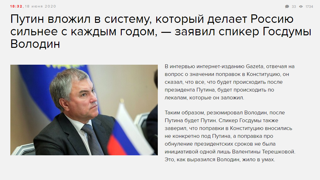 На вопрос журналиста можно ли трактовать принятие поправок в Конституцию как создание системы на «после Путина», Володин ответил: «А после Путина будет Путин».