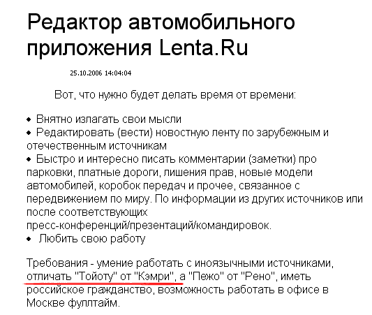 В Ленту требуется редактор автомобильного приложения. Требования очень серьезные, фиг кто выдержит...