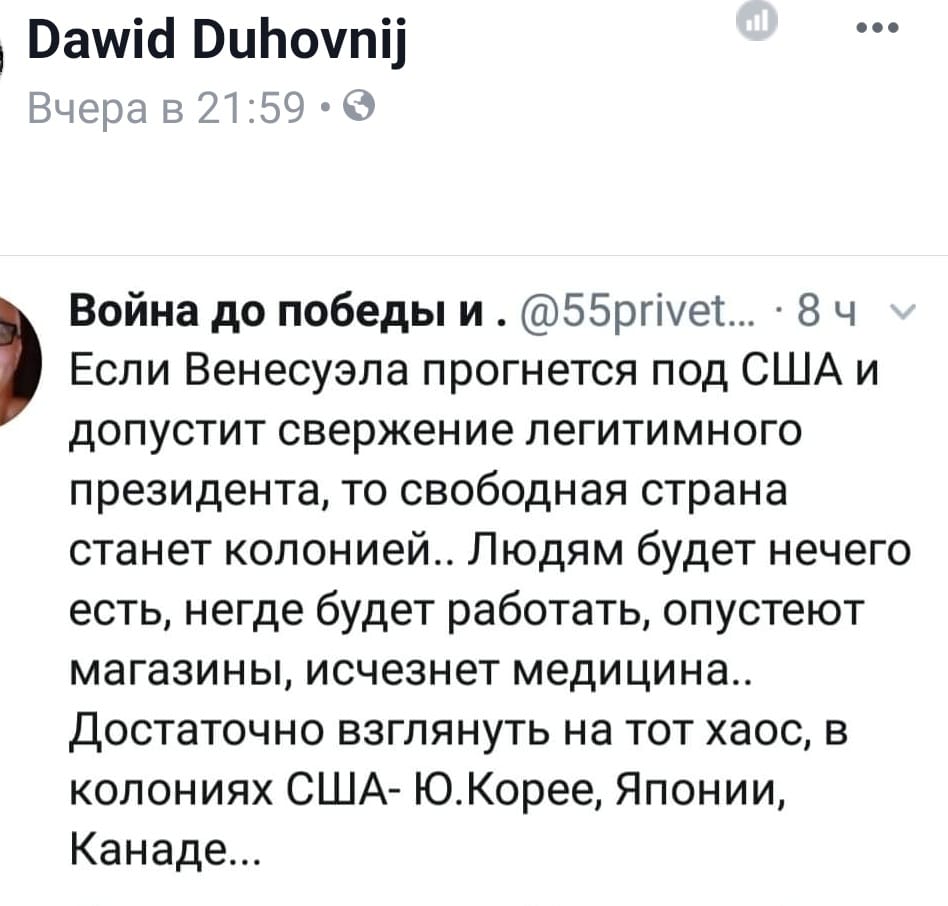 Каждый из нас в чем-то прав. Да, Венесуэлу довел сумасбродный режим. Да, развитые страны делали всё, чтоб там ситуация была еще хуже и население выступило против правительства. Да, делается это только потому, что там есть нефть. В Бангладеше, например, внутренние противостояния и нищета никого не иипёт, поэтому революции приходится как-то самим организовывать, без твитов президентов просвещенных стран