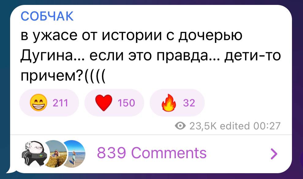 Дочь Александра Дугина убил, разумеется, Владимир Путин: тот, кто развязал эту преступную войну, убил десятки тысяч ни в чем не повинных людей, а теперь, устами своих бесконечных симоньяних будет картинно заламывать руки и наиграно удивляться: как же так могло случиться, что война пришла и в Подмосковье.6. И, конечно, мало сомнений в том, что этот взрыв будет использован для легитимации новой волны террора, в том числе — в отношении родственников тех, кто Путину неугоден. Ночной взрыв подводит под это прекрасную «теоретическую базу», да сам же Дугин ее и подведет.