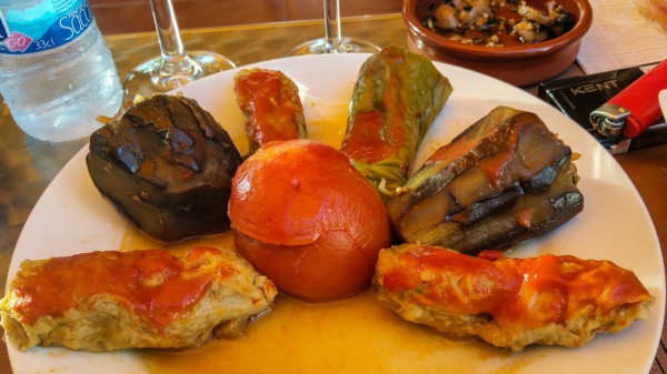 Фаршированные овощи, которые почему-то проходили под кодовым названием "это долма, но у нас виноградных листьев нету" - на четверку с плюсом, особенно фаршированные перцы.