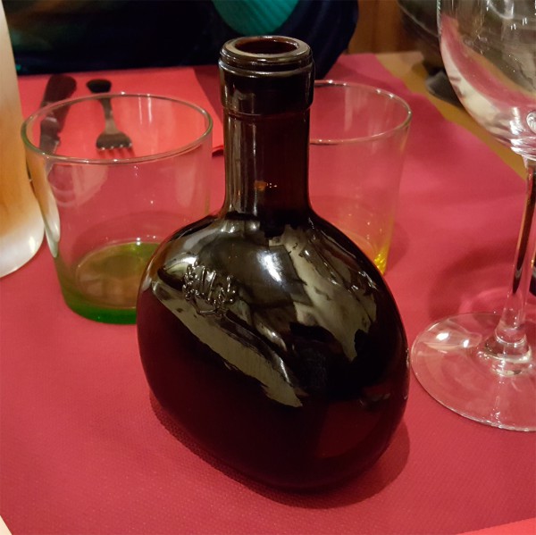 Домашнее красное вино (аргентинское, вполне приличное) подают вот в таких бутылочках - на пару с половиной бокалов, это как раз то количество, которое можно употреблять за рулем.