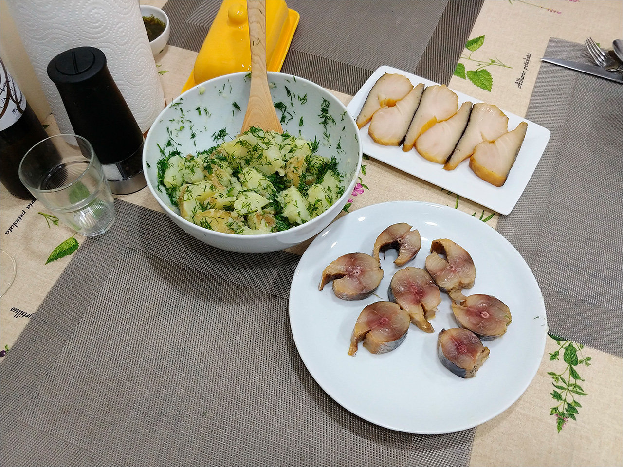 Ну и я там всегда заодно беру шикарную скумбрию горячего копчения и масляную рыбку холодного копчения. Под них покупаю молодую картошку, варю, посыпаю укропом (укроп тут тоже можно купить только в русских и китайских магазинах) - и устраиваю ностальгический праздник желудка. Вот просто вкуснотища!