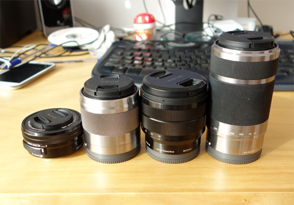 Поснимал вчера SEL 1018 чуть-чуть города и пейзажей. Объектив, конечно, раза в три больше китового 16-50 (в его выключенном состоянии), но оно того, как мне кажется, стоит. Вот этот объектив, третий слева в линейке: универсальный китовый, портретный полтинник, ширик, телевик (паршивый).