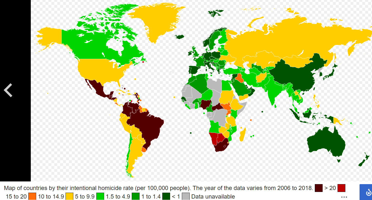 Though some discrepancies exist in how specific categories of intentional killings are classified, the definitions used by countries to record data are generally close to the UNODC definition, making the homicide rates highly comparable at the international level.[13] UNODC uses the homicide rate as a proxy for overall violence, as this type of crime is one of the most accurately reported and internationally comparable indicators.[4]